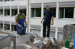 Der Bauhof der Stadt hat in den Ferien das Beet einen halben Meter tief ausgehoben und mit etwas Kies ausgekleidet. Außerdem lieferte er etwa drei Kubikmeter Lavagestein und 26 Findlinge. Philipp und Herr Wagner besorgten in den Ferien einige Betonröhren, in die die Kübel der Pflanzen versenkt werden sollen.