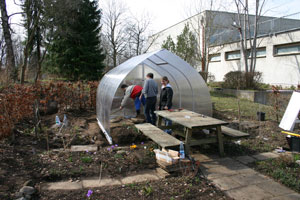 Ebenfalls in den Schulferien wurde in unserem Schulgarten ein Gewächshaus aufgestellt, die künftige Orangerie, in der unsere Exoten im Winter ein warmes Plätzchen finden werden. Auch die Anzucht von Jungpflanzen für den Sommerflor wird im Gewächshaus besser gelingen, als in überheizten und lichtarmen Klassenzimmern. Am Ende des Hauptweges gelegen, mussten ihm einige Schülerbeete teilweise geopfert und um 90 ° gedreht werden. Frau Gonzales, Herr Froschermeier, Herr Sturm und Herr Wagner waren einen halben Tag mit dem Aufbau beschäftigt. Nun wird um das Haus noch gepflastert und die teilweise verlegten Schülerbeete wieder angelegt. Die ersten Kübelpflanzen sind bereits eingezogen, wie z.B. unsere Cannas, die orientalischen Lilien, Wandelröschen, Fuchsien, Papyrus, die zauberhafte Prinzessinnenblume und eine Zwergbanane. Philipp und Andi halfen fleißig beim Umzug. Auch die Sommerblumen wurden angesät und beginnen bereits zu sprießen. Es wird auch Zeit, denn in etwa zwei Monaten sollen sie bunte Farbtupfer in die Beete zaubern ...