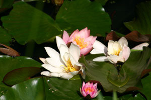 ihre Blüten geöffnet. Die Seerosen haben am Grund des Weihers lange, armdicke